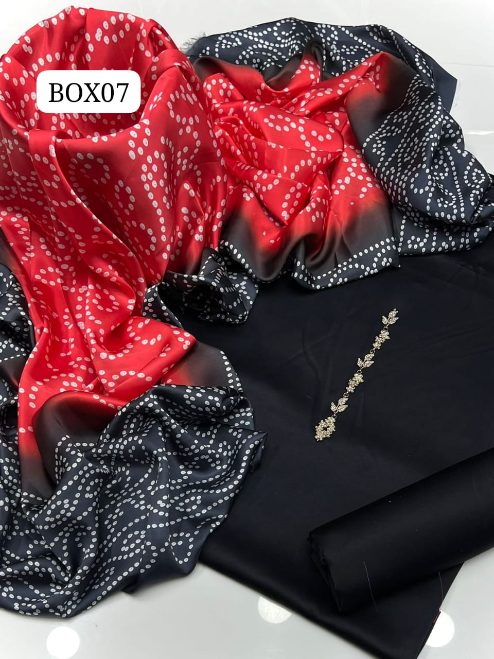 STuff Kattan SIlk Plain Shirt And Plain Trouser WIth Shamoz SIlk Chunri Digital Print Dupatta 3PC Dress