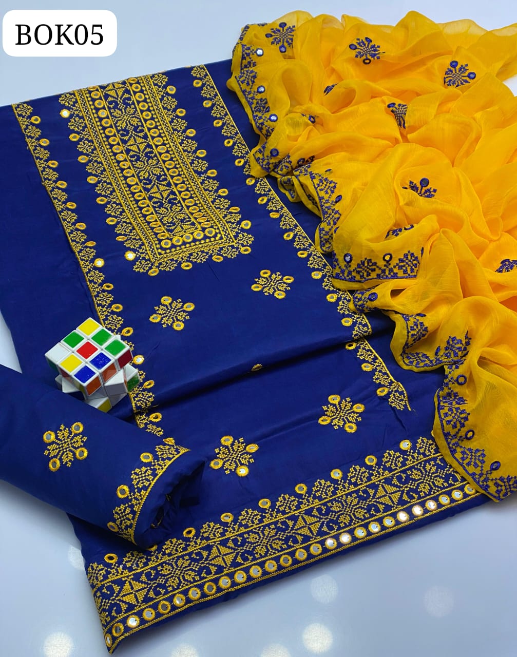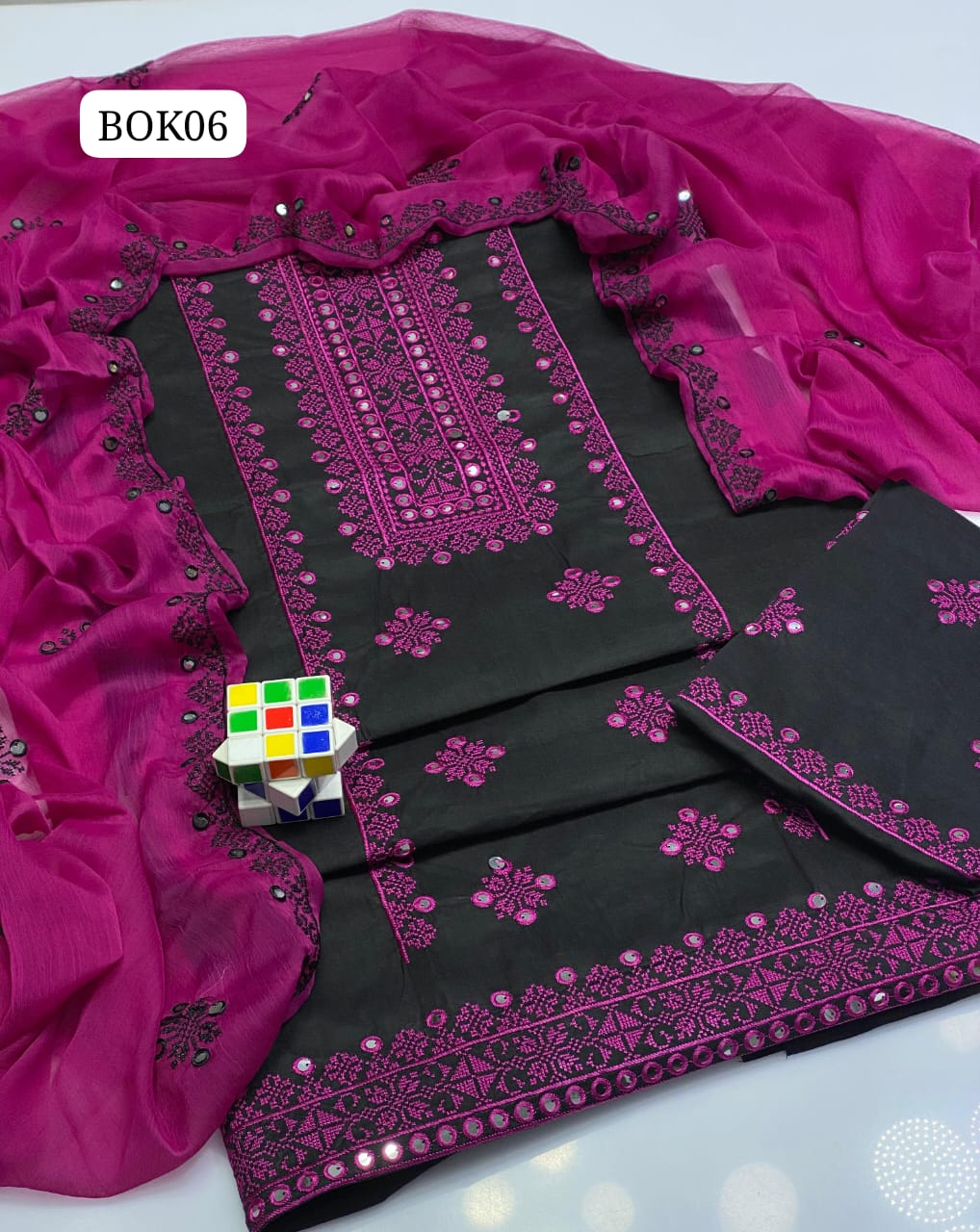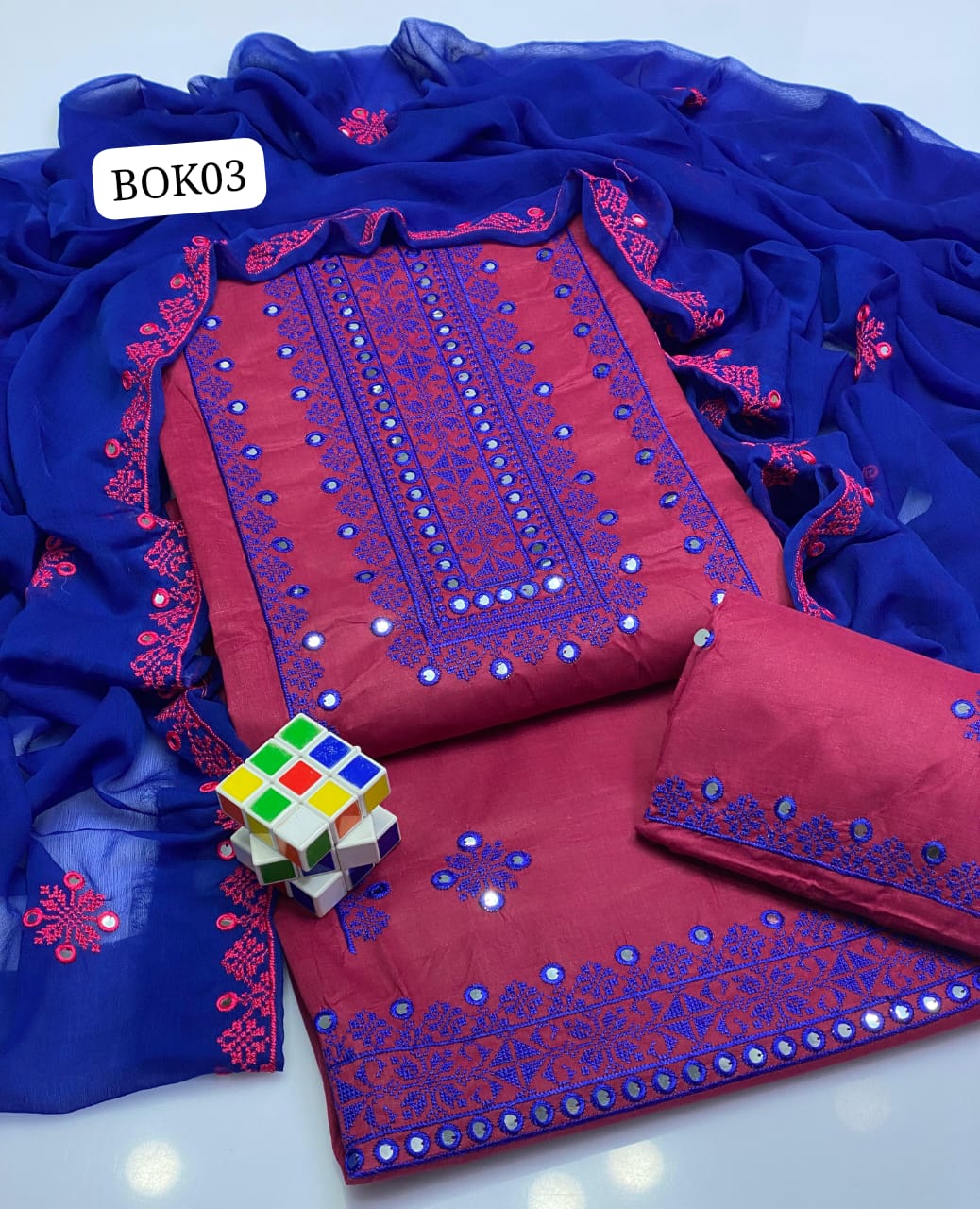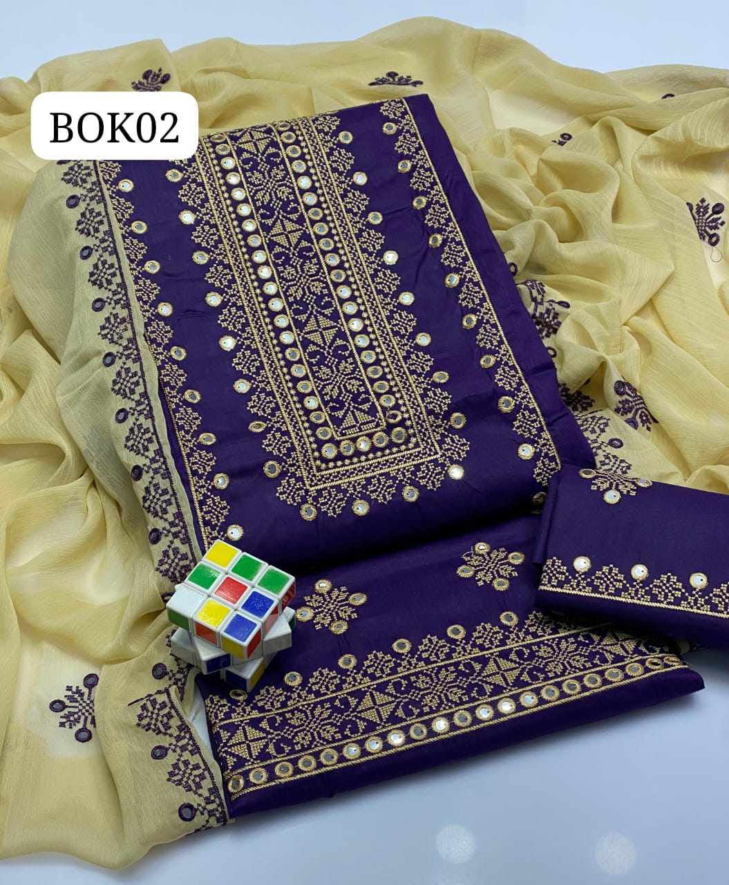 Stuff Lawn Cotton Front Full Gala Daman 9MM Plastic Mirror Embroidery SHirt ANd 9MM Plastic Mirror Embroidery Dupatta With Embroidery Trouser 3PC Dress