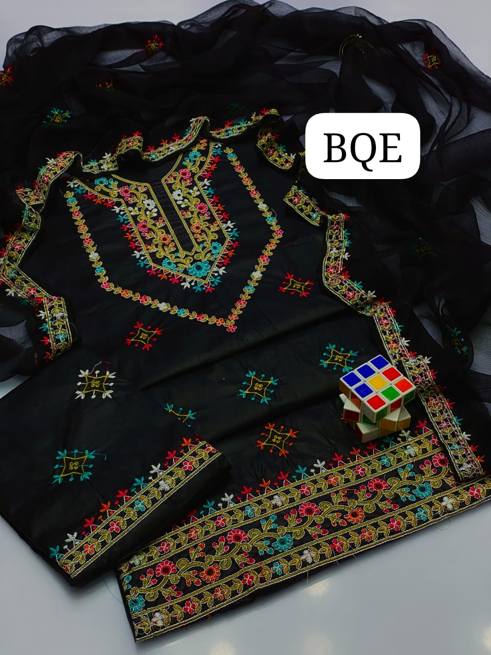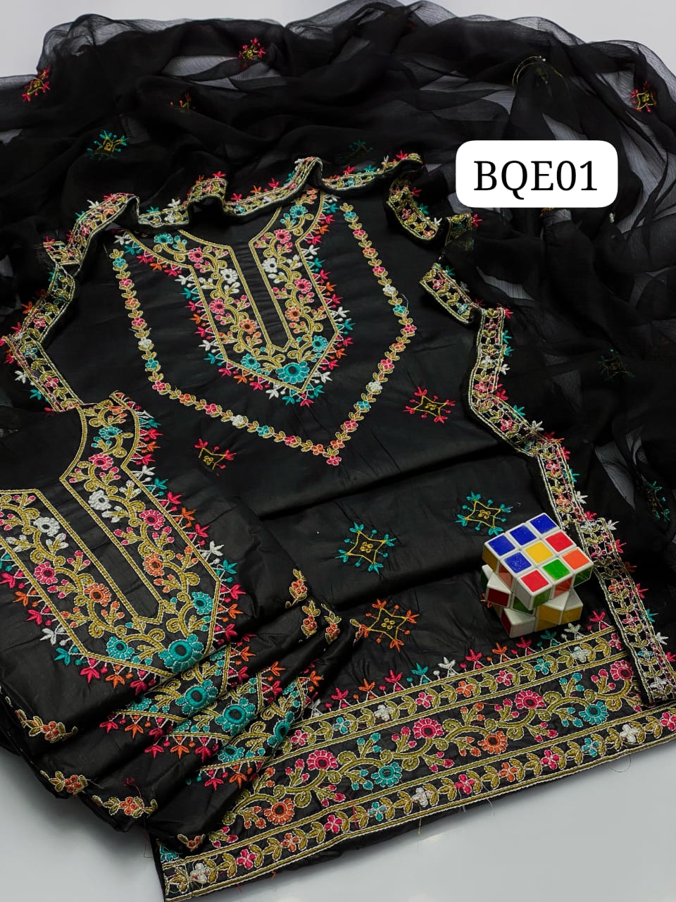 Stuff Lawn Cotton Front heavy Gala Daman Multi Embroidery Shirt And Trouser With Chiffon Embroidery Dupatta 3PC Dress