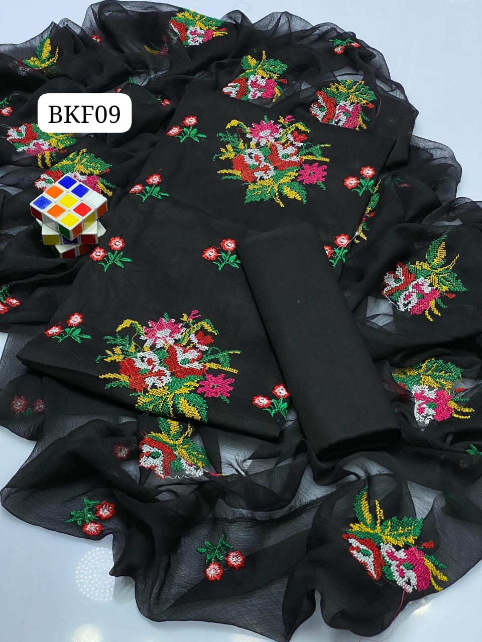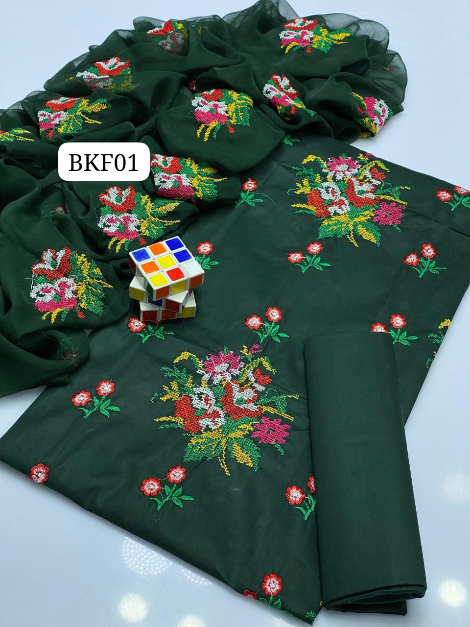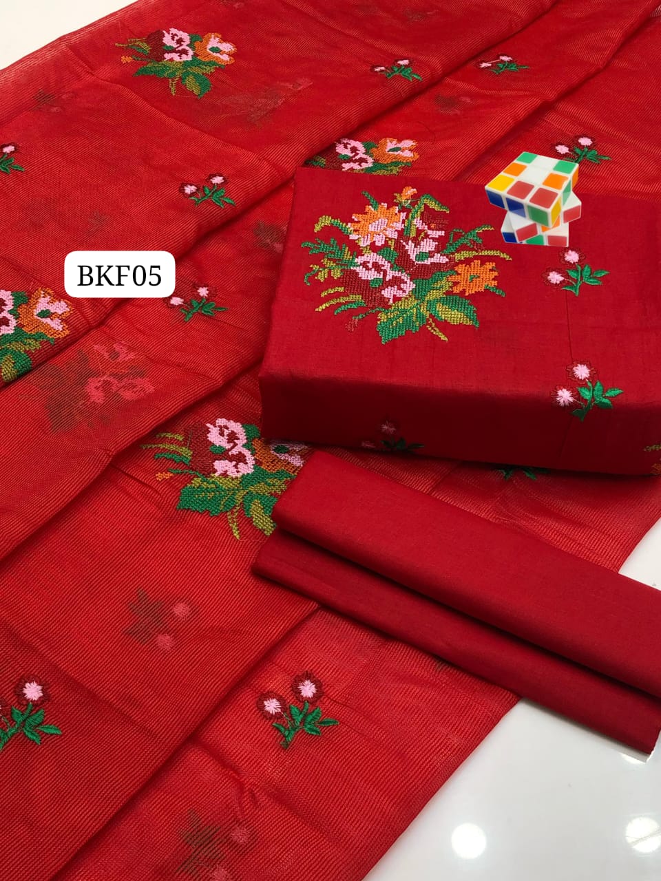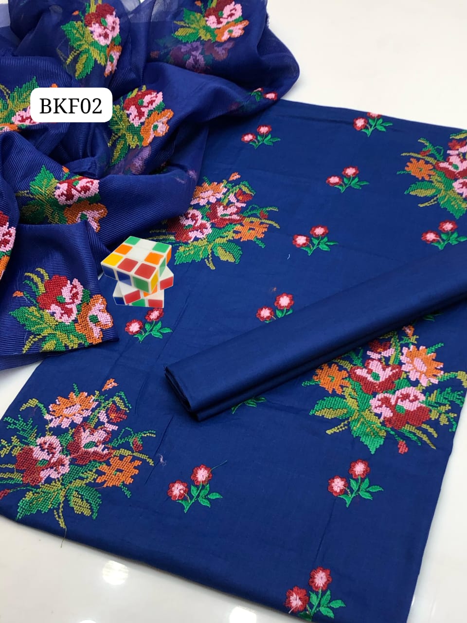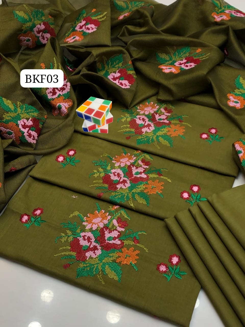 Stuff Lawn Cotton Heavy All Over Cross Stich Gulab Embroidery Shirt And Khaadi Net Embroidery Dupatta Ad Plain Trouser 3PC Dress