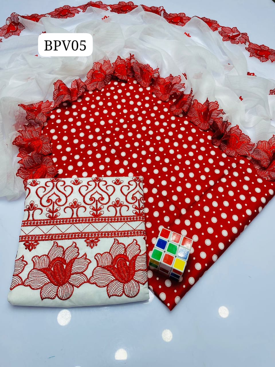 STuff Lawn Front Back & Saleeves Polta DIgital Print Shirt And EmbroideryTrouser WIth Chiffon CutWork Embroidery Dupatta 3PC Dress