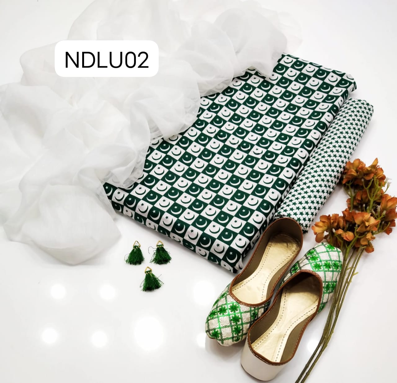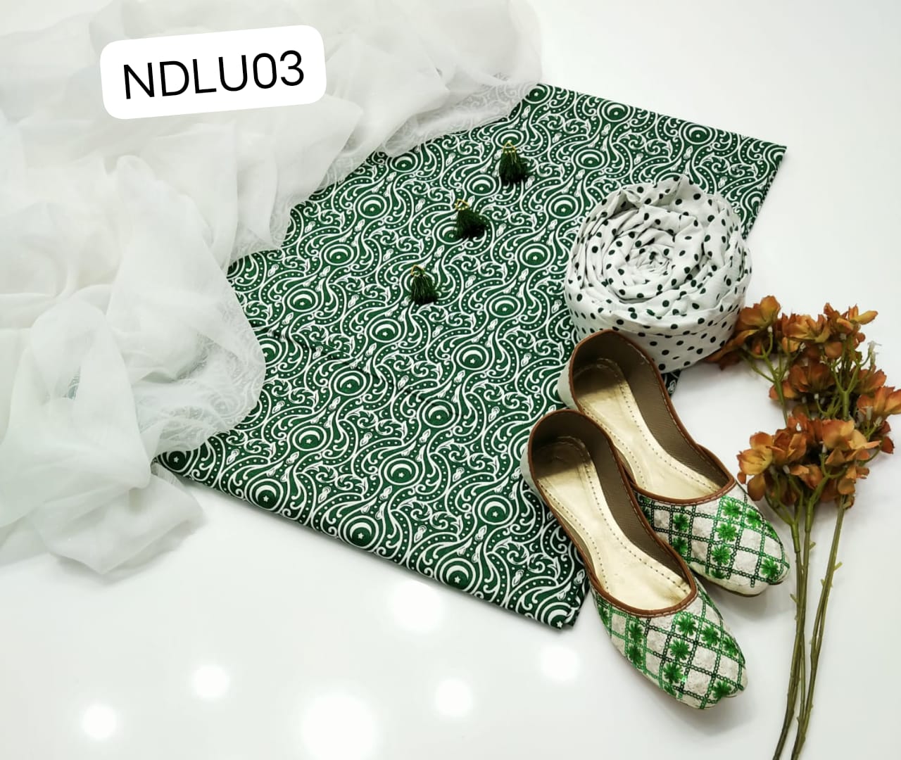 3 Meter Shirt (Lawn)2.5 Meter Dupatta ( Chiffon)2.5 Meter Trouser (Lawn)