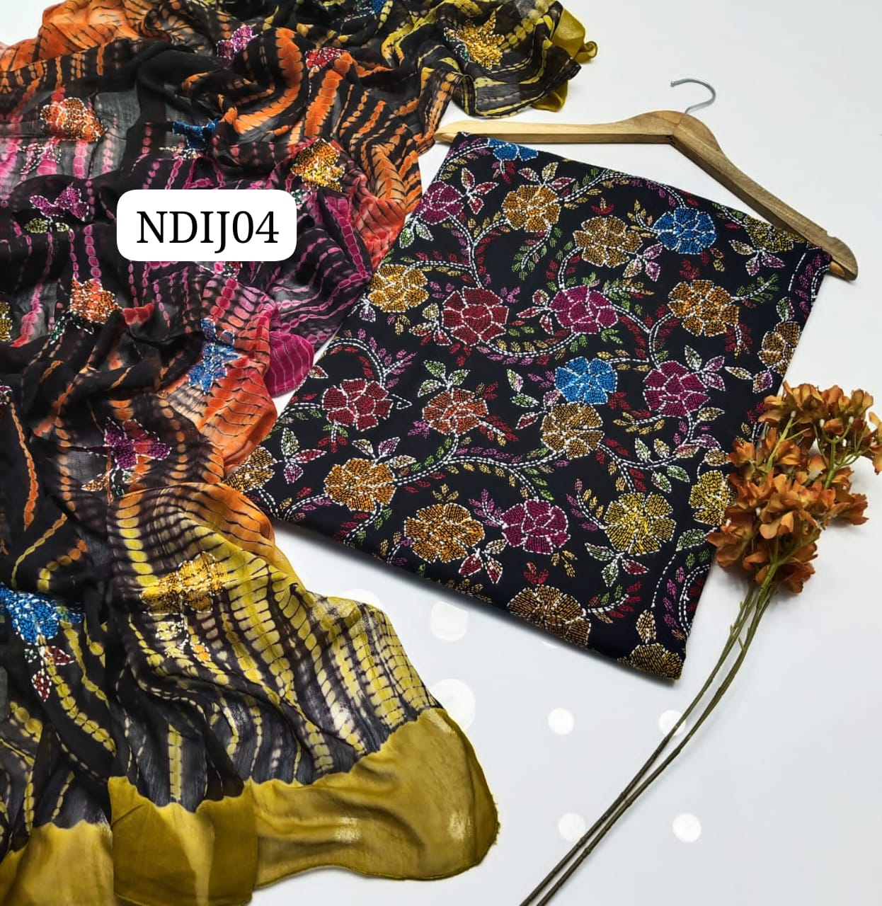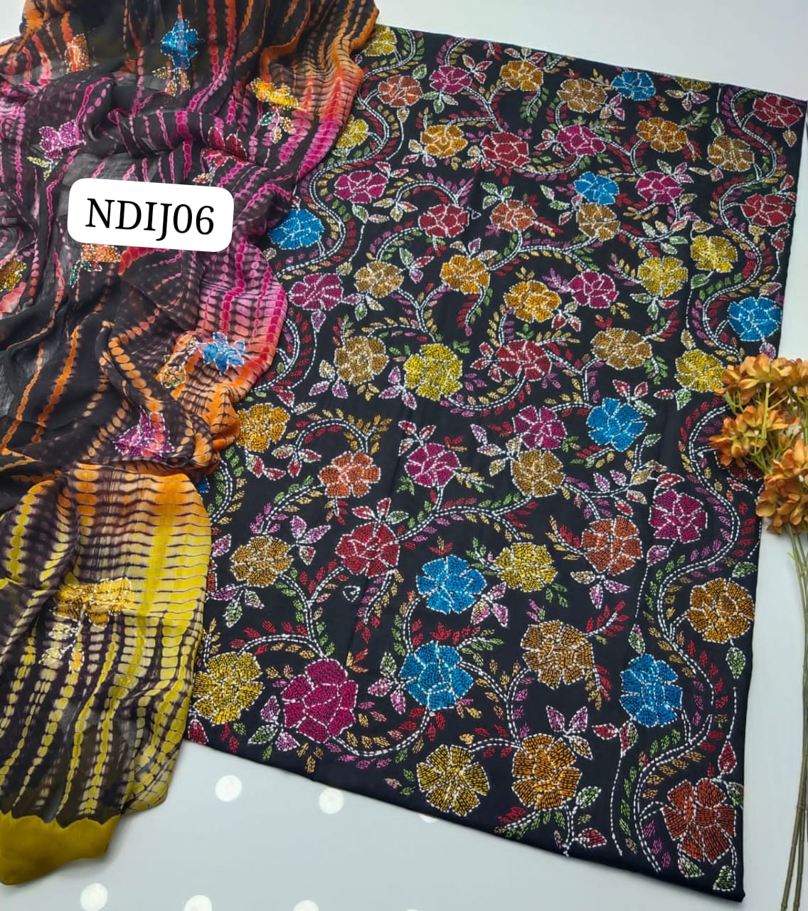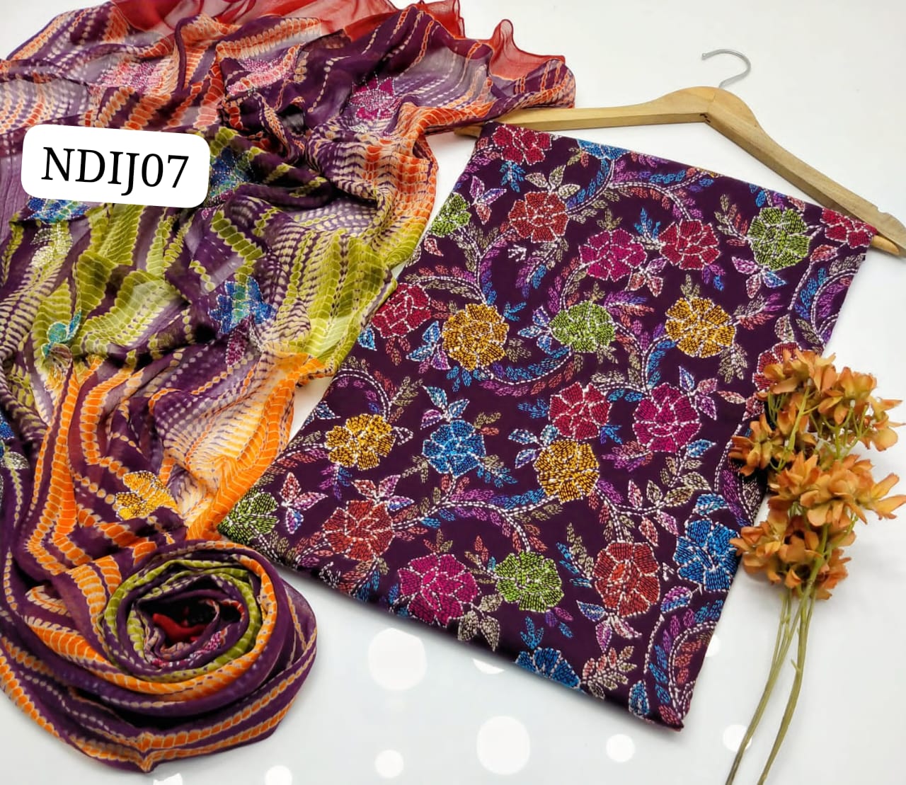 Stuff Pure lawn 100/100 Handmade kacha Indian jall Neat Work Shirt And Plain Trouser With Chiffon Tye And Dye Embroidery Dupatta 3PC Dress