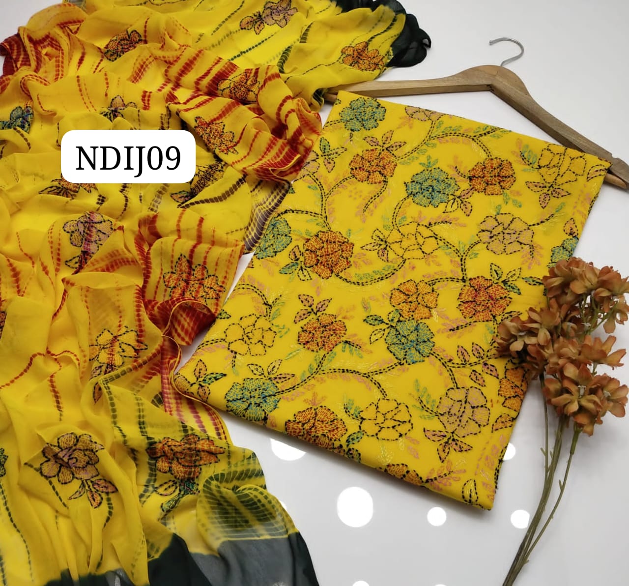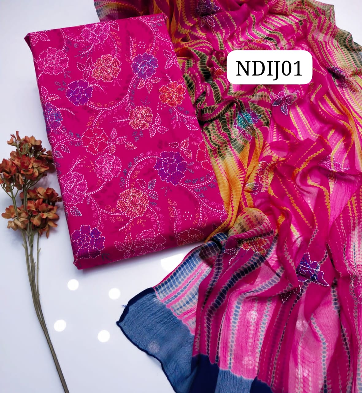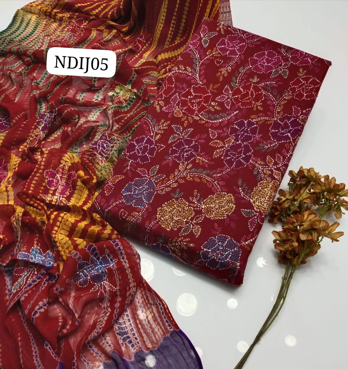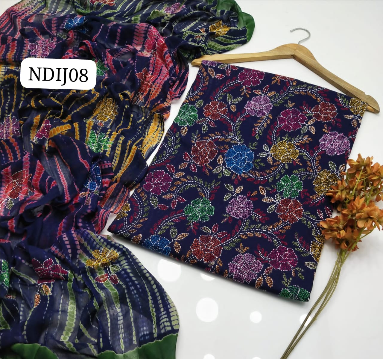 Stuff Pure lawn 100/100 Handmade kacha Indian jall Neat Work Shirt And Plain Trouser With Chiffon Tye And Dye Embroidery Dupatta 3PC Dress