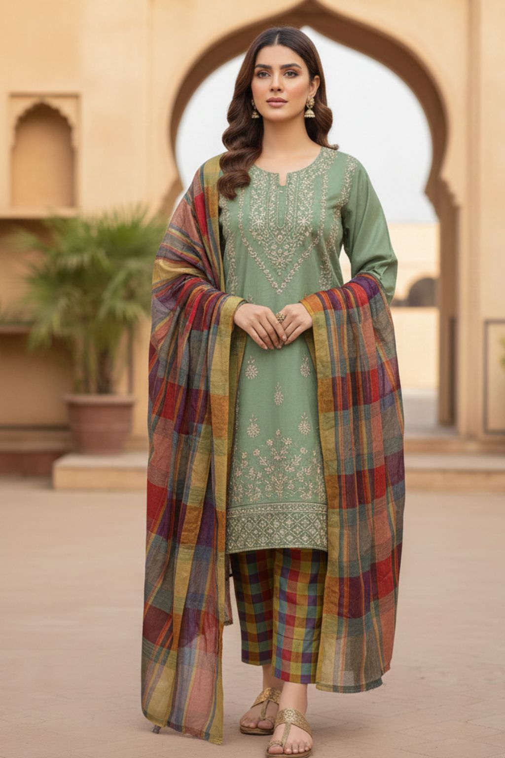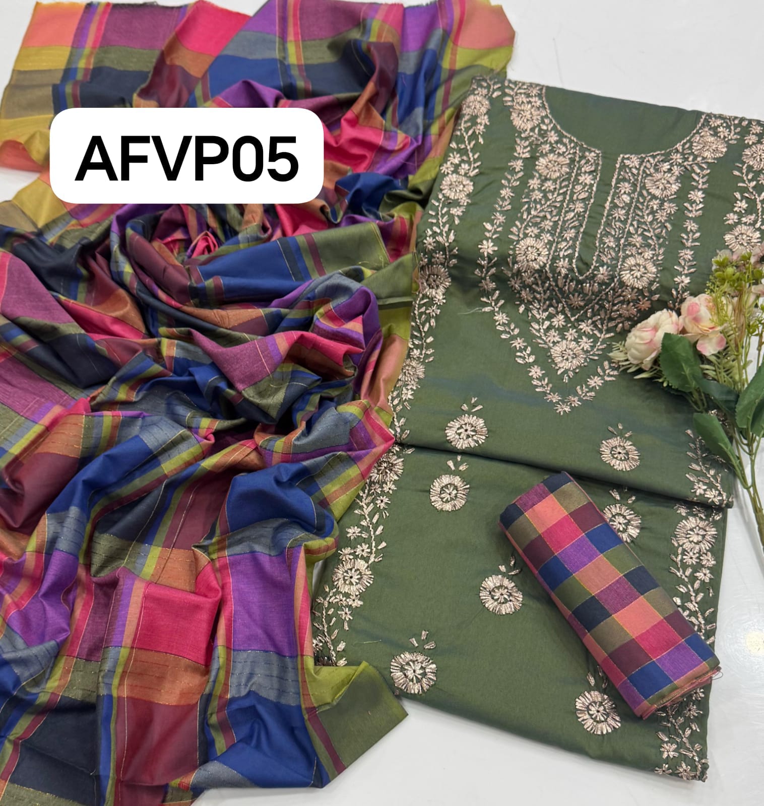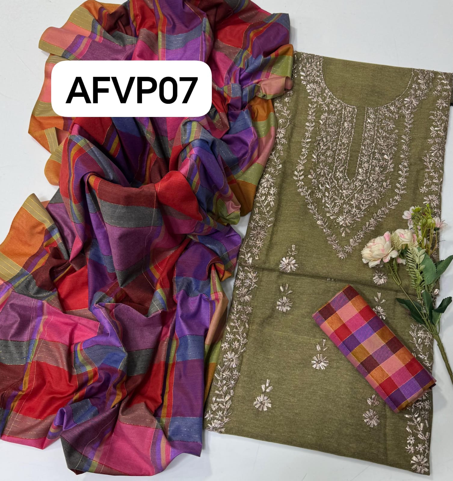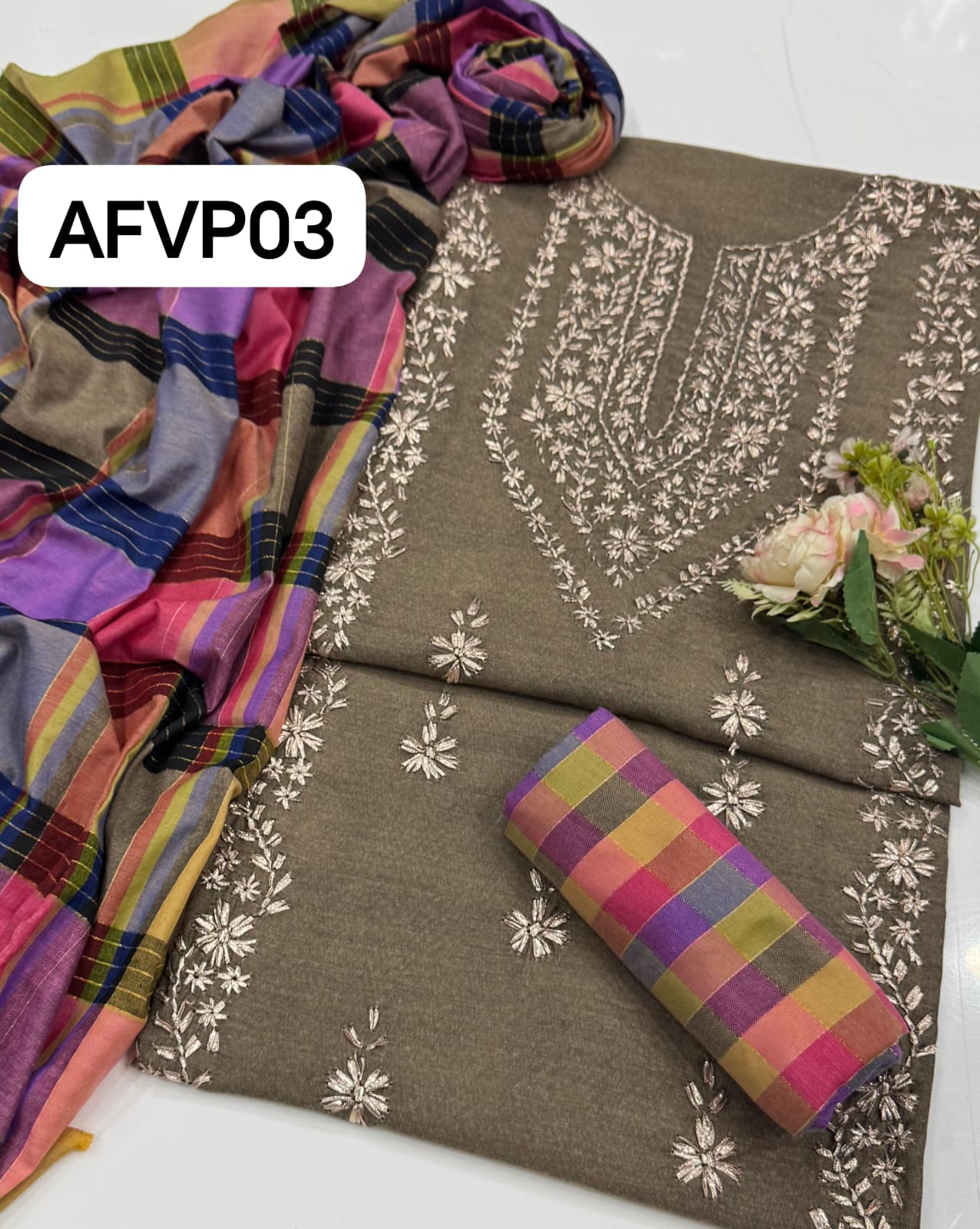 Khaddi Hand made gotta work new design gala bail boti gall shirt with plan check style trouser along with check style plan duppata