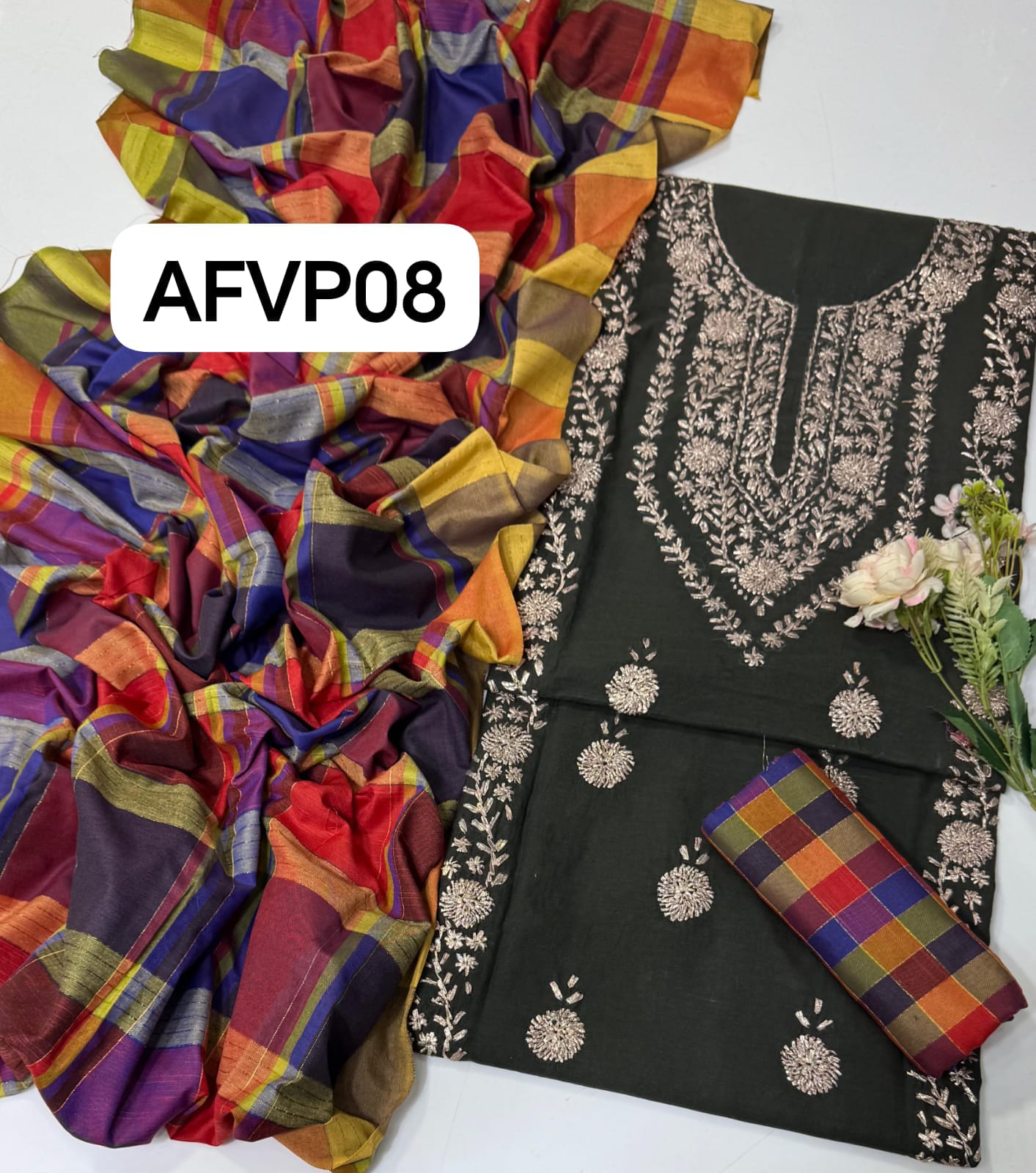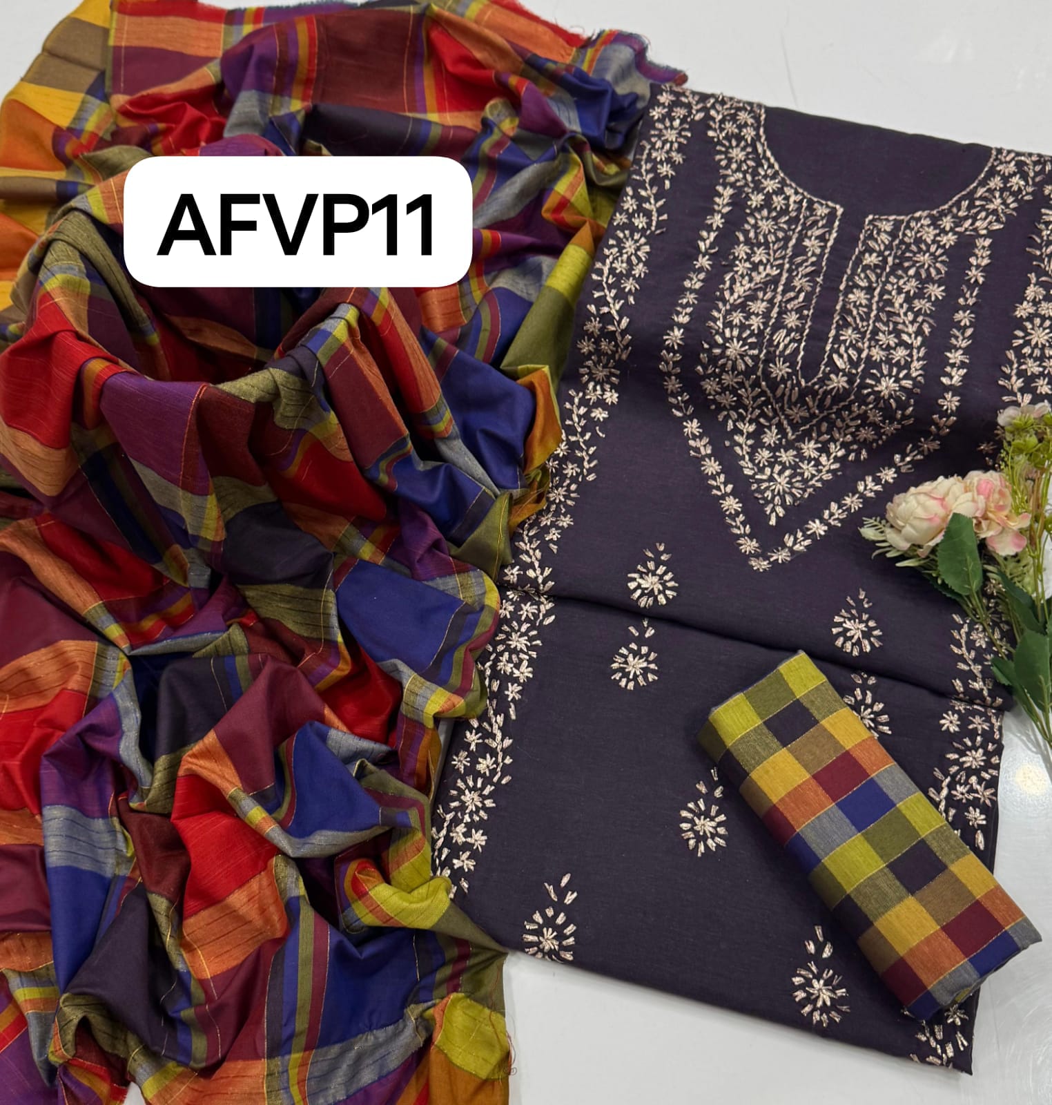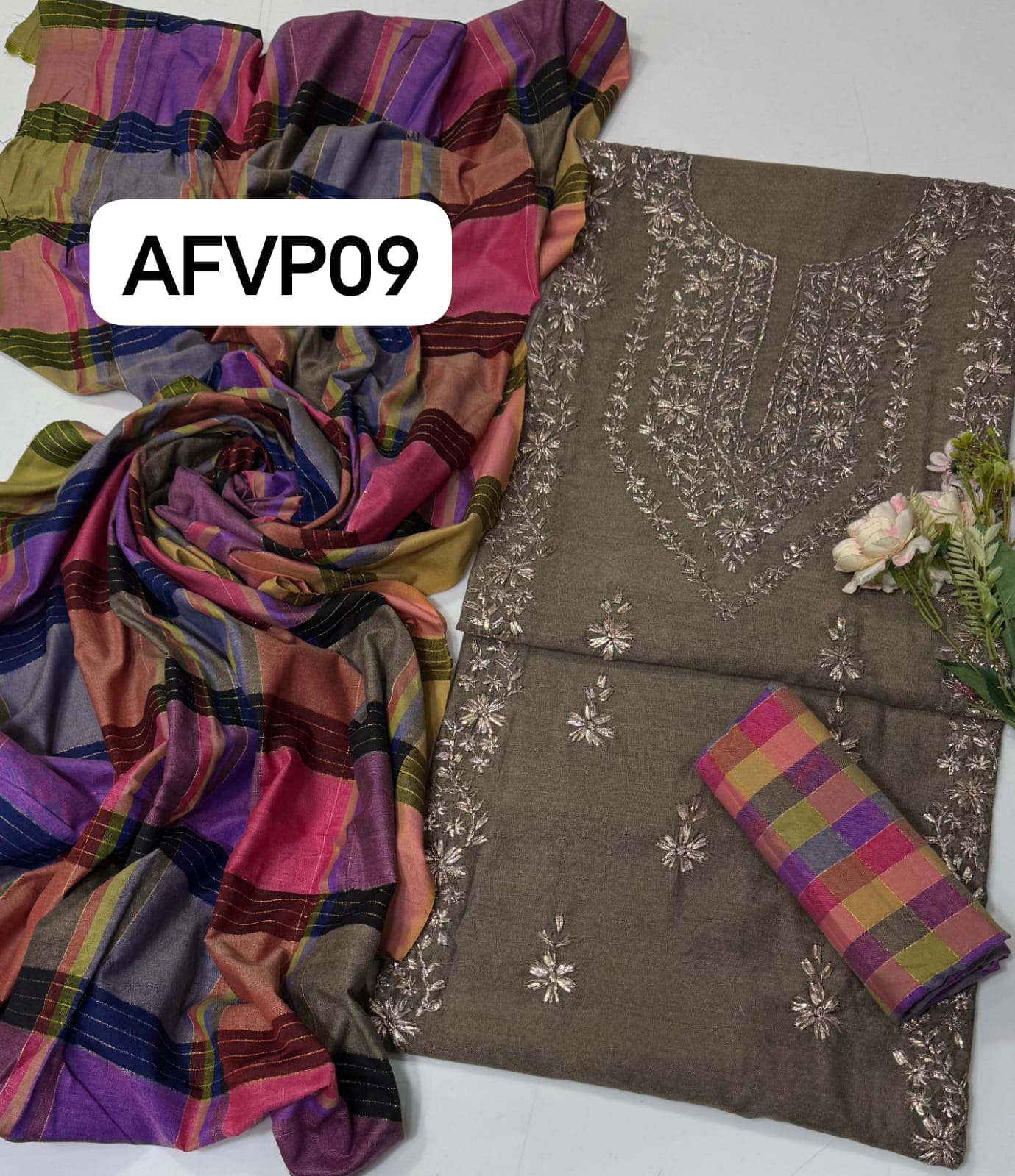 Fabric : Khaddi Hand made gotta work new design gala bail boti gall shirt with plan check style trouser along with check style plan duppata