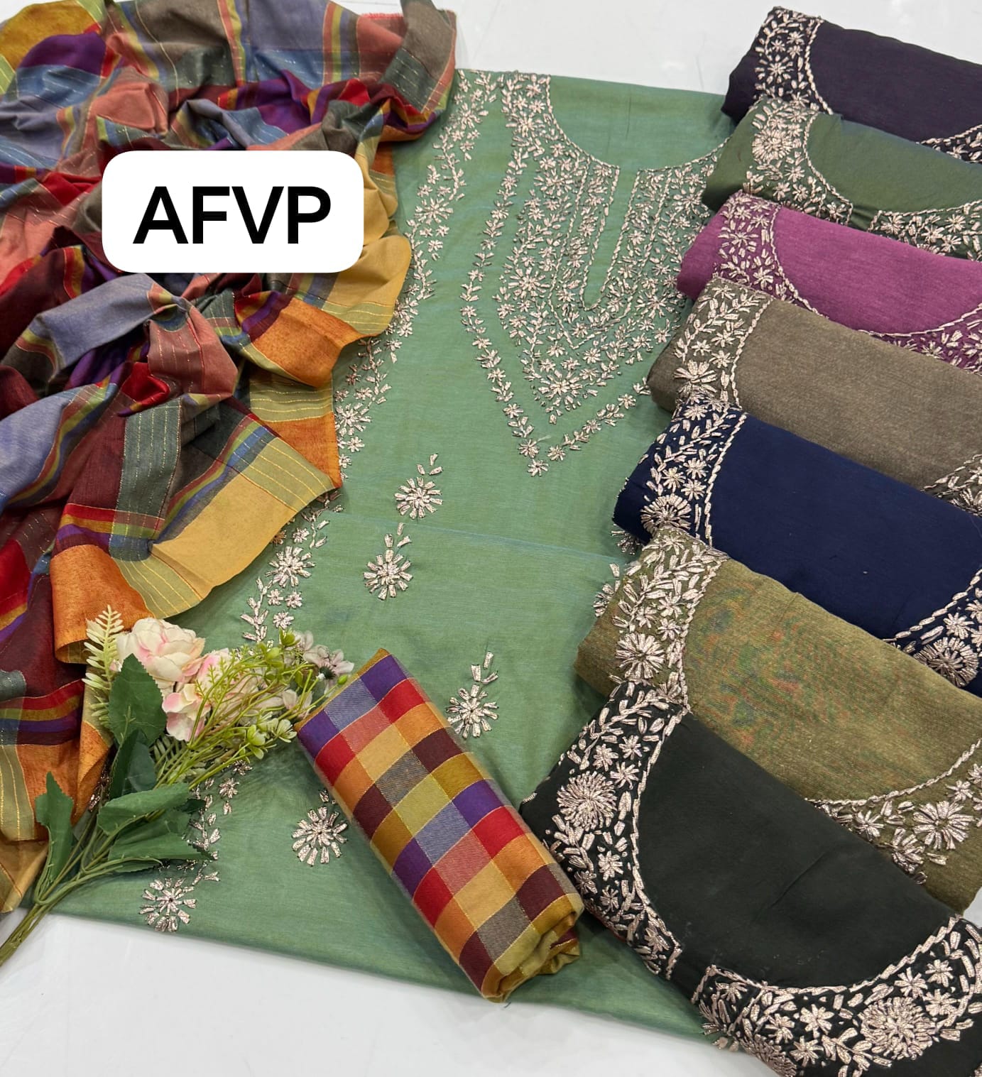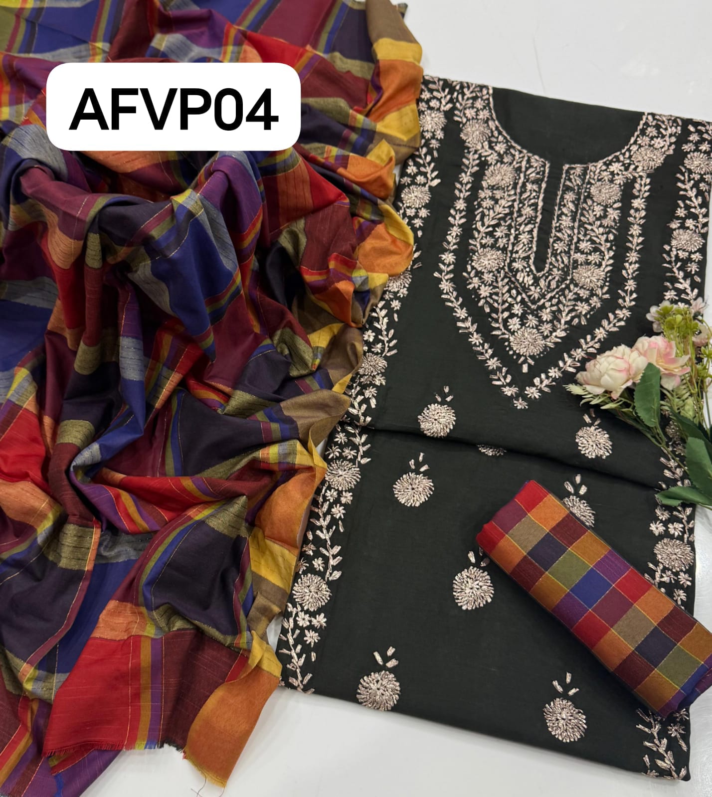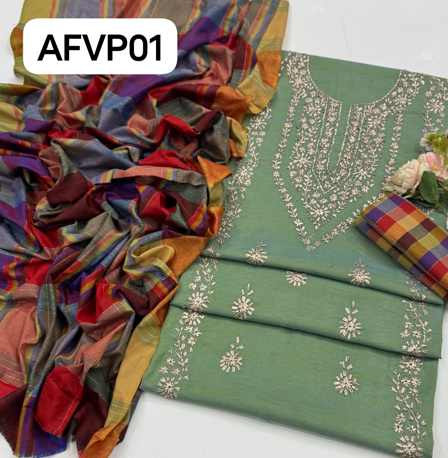 Fabric : Khaddi Hand made gotta work new design gala bail boti gall shirt with plan check style trouser along with check style plan duppata