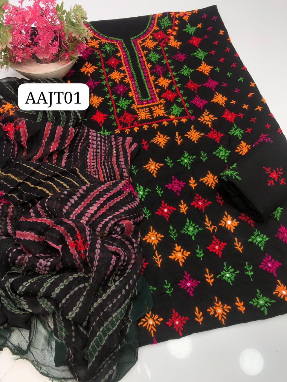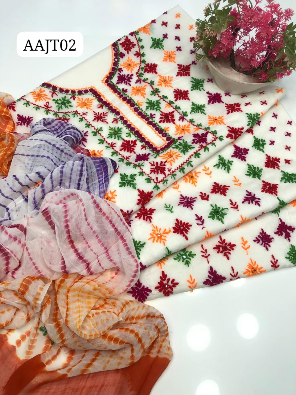 STuff lawn Fancy Kaaj Gala Mirror handmade Embroidery shirt And Trouser WIth Spanish Tye And Dye Chiffon Dupatta 3PC Dress