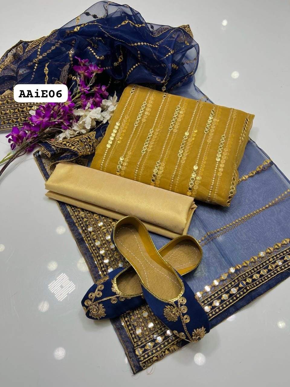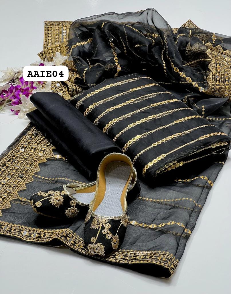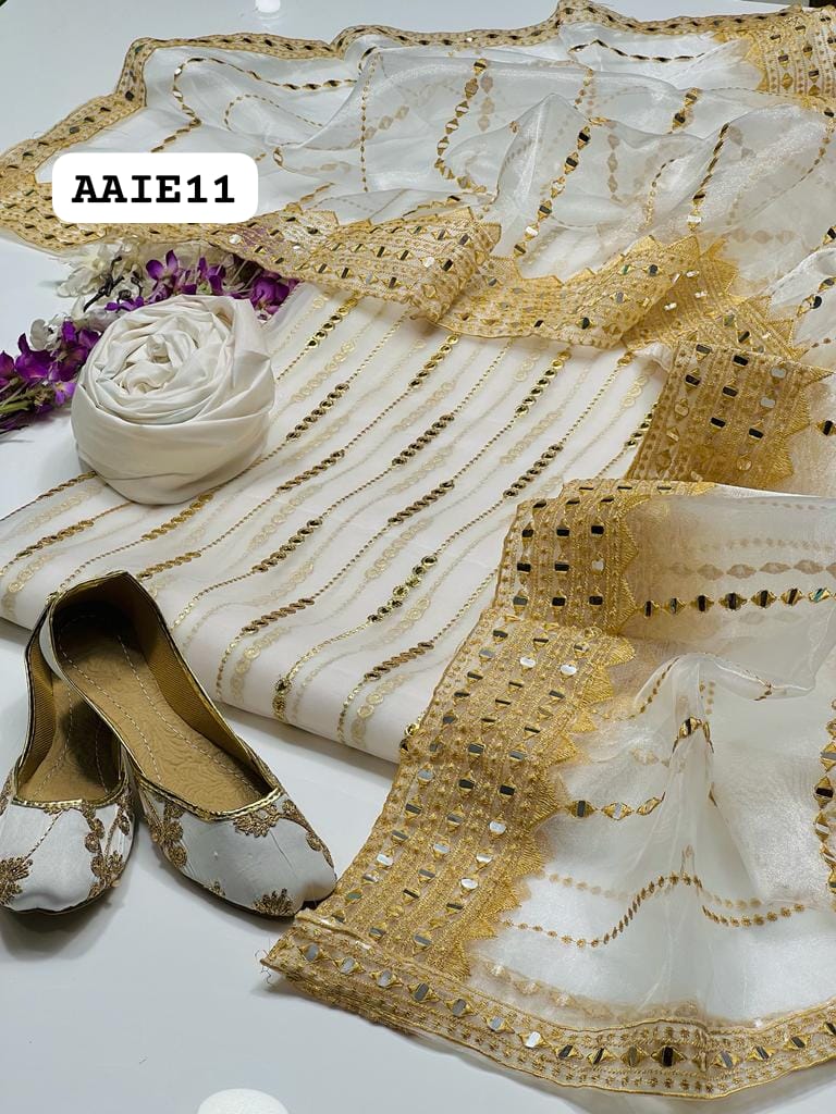 3 Meter Shirt ( Organza)2.5 Meter Dupatta(Organza))2.5 Meter Trouser ( Masoori))