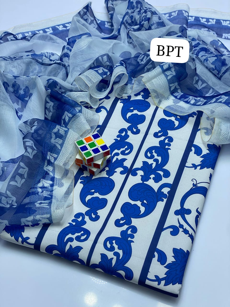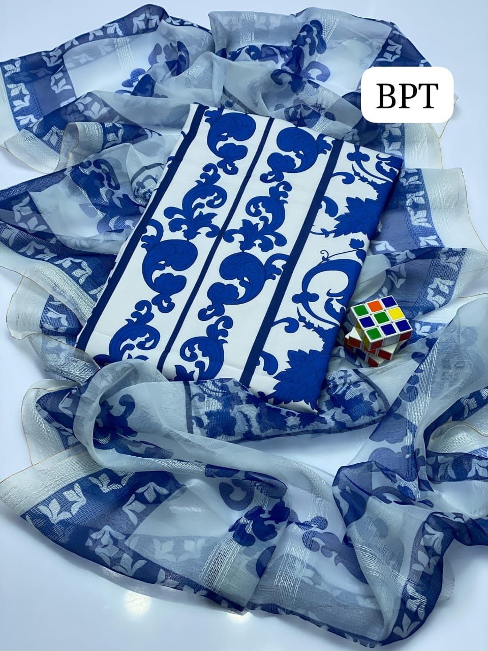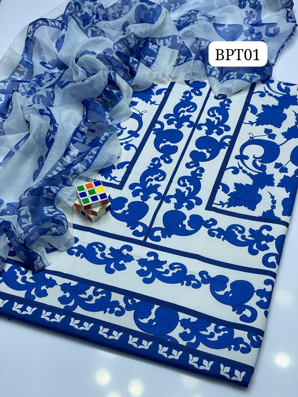 Stuff Swiss Lawn Front Back & Sleeves Printed SHirt And Printed DUpatta With Trouser 3PC Dress